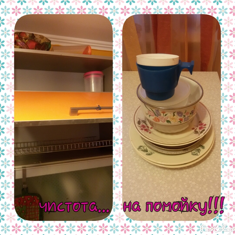 Сегодня у меня было 2 дела по 15 минут. 1-ое разобрала 2 кухонные полки . У меня есть верхняя полка а-ля "посуда для гостей" . Если праздник большой, мы арендуем квартиру у мамы в соседнем доме у нее 4-х комн, а если приходят чисто к нам то обычно немного но все равно для разных салатов нарезок и т.д у меня посуда которая достается 2-3 раза в год. и вот с ней сегодня разбиралась. там много еще "бабушкиных " тарелочек со сколами и трещинами, так вот их с радостью выбросила ))) Остальное запихала в посудомойку освежить. А самая верхняя полка с розовой баночкой ... у меня там хранились... не поверите.... банки!!! Ужас на видном месте такая порнография, все сняла для выноса к маме, а туда поставлю обязательно как куплю красивые баночки для круп. и 2-ая 15-ти минутка это пропылесосила , и действительно это заняло у меня ровно 15 минут с учетом времени подготовки (поднять все что мешается с пола) . Здорово теперь я знаю что пылесосить квартиру занимает 15 минут ровно если не отвлекаться на другие занятия .
