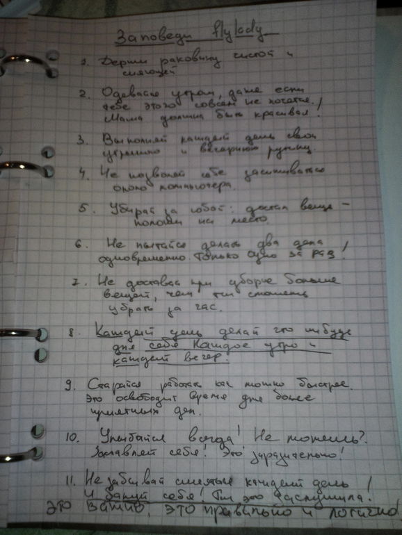 Сегодня у меня опять гости,приезжала мама,воспользовалась случаем и погладмла тюль,которую вчера сняла и постирала.и знаете,что? НИКОГДА ещё я так быстро её производила постирку штор.обычно снимают,стираю и ещё минимум неделю они валябтя неглаженные и не подвешенные! Я молодец! Работа в зоне заключалась сегодня в тщательной помывке пола,что то я расслабилась,ели уложилась в 15 минут.отмыла все под стенкой,выгребла от туда кучу игрушек.протерла плинтуса.заповеди переписала: