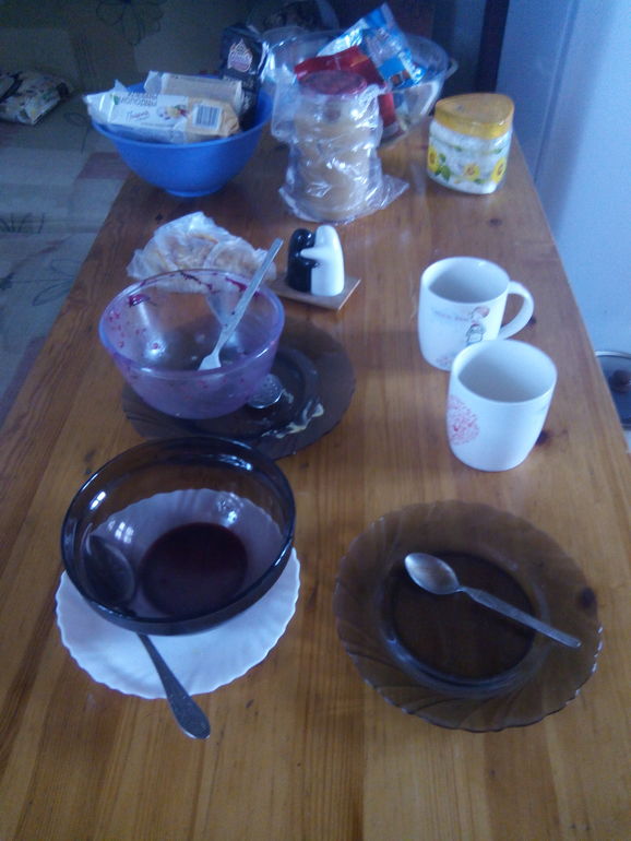 в качестве еще одной отправной точки я выбрала кухонный стол, за которым мы обедаем.. одно время у меня была привычка постоянно соблюдать на нем порядок - очень мне нравилось утром пить чай в одиночестве за чистым столом, но постепенно навык куда-то делся, и периодически я стала находить по утрам вот такую картину :