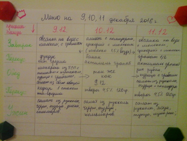 * Так же на холодильнике висит меню на ближайшие три дня мне, так как сын будет у бабушки.