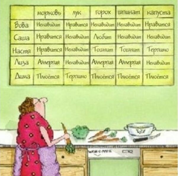 Пункт 2. Составить таблицу с любимыми и не любимыми блюдами. Дописать у кого на что аллергия и кто какие отдельные продукты не ест.