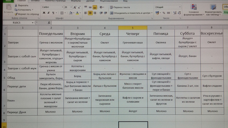 В пятницу на сайте, где есть муж просматривает каталоги 4 основных для нас магазинов - Пятерочка, Дикси, Окей и Карусель. Выписывает предложения интересные по мясу, молочке, сыру-колбасе и бытовой химии. Вечером в пятницу я накидываю примерное меню на неделю с учетом предложений в магазинах и того, что у нас есть в холодильнике. Утром в субботу мы закупаемся (едем рано, к 11 уже дома обычно). Потом ещё раз обговариваем. И я распределяю, что и когда мне готовить в табличку. В распределении и обсуждении участвует вся семья - сын выбирает десерты и, иногда, завтраки, муж супы и вторые блюда. Я на диете, так что расписываю в конце свою еду с учетом того, что они захотели - например, муж захотел куриные голени, и я их ему буду жарить, а себе запеку без кожи или приготовлю на пару. И да, у нас часто бывает, что все члены семьи едят что-то разное.