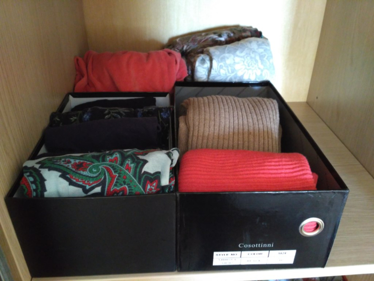 Моя полочка с домашней одеждой и повседневная частично тут лежит. После марафона расхламления решила сложить одежду по Конмари, но на середине закончились коробки для обуви :))