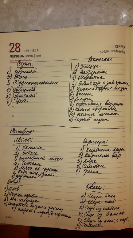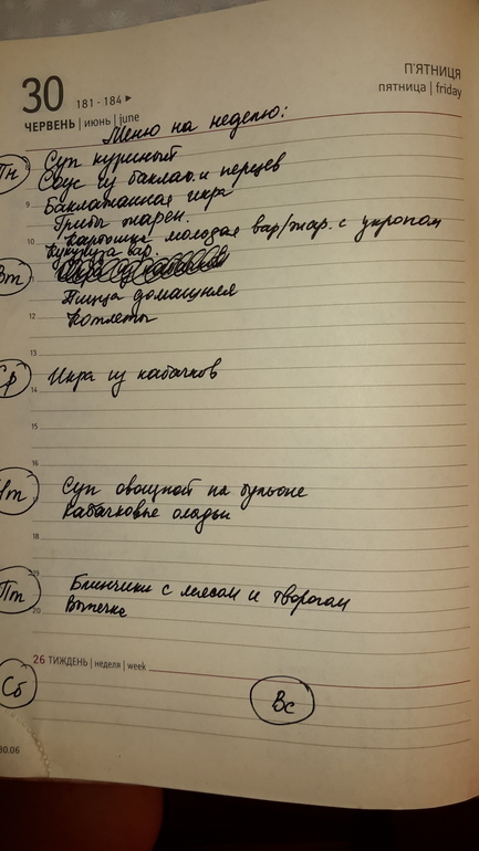 В меню на неделю пишу только то, что готовлю в этот день. То есть если суп вчера сварила на два дня, я его не пишу. Или пиццу, или блины, и т.д. По сути у меня меню - это список блюд, которые нужно приготовить в каждый конкретный день. Так очень удобно!