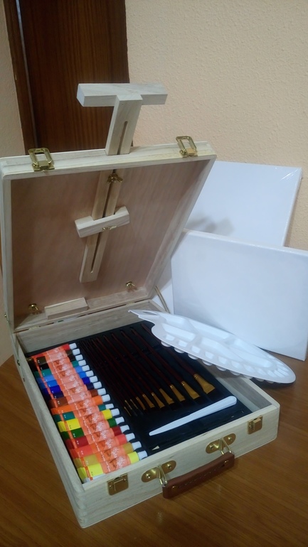Вчера сходили пешком в Альди (от нас в 3 км) и купили мне художественный набор с планшетом, красками, кистями и другими штучками для художников. Ооочень рада, сейчас акрил как раз осваиваю.