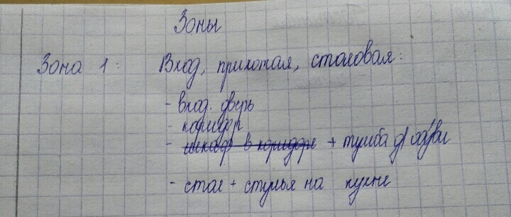 Мне сложно далось деление на зоны. Возможно буду переделывать в процессе. В первом взлете я думала, что делить надо именно по комнатам. Т.к. у нас вечный ремонт, гостиной нет. Есть только недоделанная аомната с телевизором, ко орый никто не смотрит, т.к. нет дивана)). Поэтому к ней определила несколько мест из др.комнат.