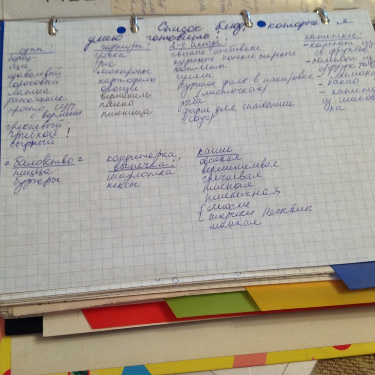 Чтобы как можно реже расстраиваться из-за этого, мы составим список блюд, которые можем готовить. И в конце недели (или перед покупкой продуктов) прикиньте, чем будете кормить семью в следующую неделю. Нам ведь важно обеспечить себе необходимый набор продуктов чтобы семья ужинала/обедала/завтракала вместе. И желательно чтобы у мамы в этот момент не дергался глаз от осознания собственного героизма.