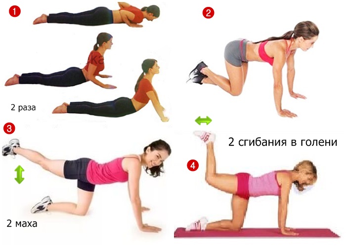 1. Отжимания на трицепс 2 раза (1 картинка), подъем на колени и махи ногой 2 раза (3 картинка) и сгибание голени 2 раза (4 картинка). Полное упражнение 10 повторов