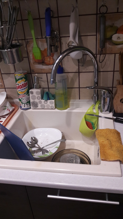Итак, вчера дома весь день был муж, соответственно поел и составил всю посуду в раковину, вечером меня ждала вот такая кухня