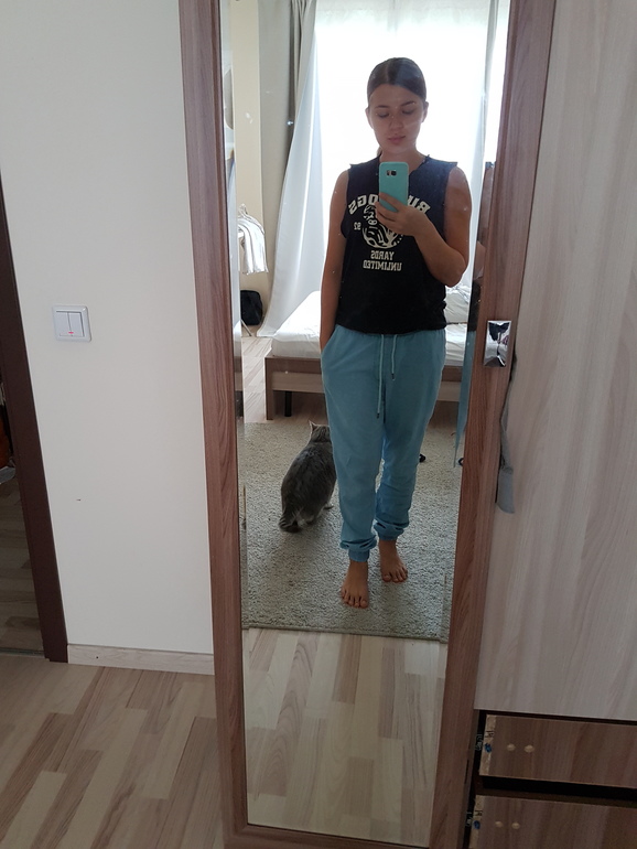 Это мой обычный вид. Дома хожу в джогерах и футболках всегда. Халаты никогда не носила. Обувь никакую не признаю дома. Всегда приходя домой первым делом снимаю носки/колготки. Была бы возможность-ходила и по улице бы босиком)