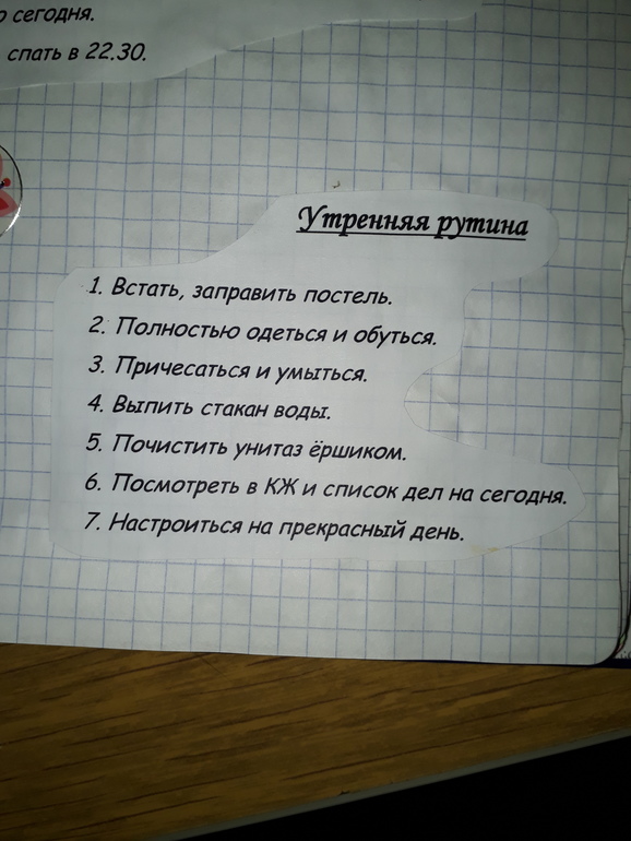 Вместо наклеек вчера откопала свой старый контрольный журнал, которым пользовалась очень недолго, и посмотрела план утренней рутины.
