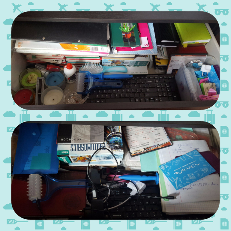 Ну а ниже моя скромные труды. Ящик для ВСЕГО! Снизу "до", сверху "после". Сложила аккуратнее, часть выкинула, часть перераспределила по другим более подходящим местам.