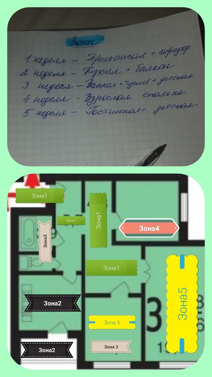 По основному заданию, на 8 день. Деление на зоны. Все утро провела в планировании и делении, читала советы девочки из поста, ссылочку на который скинула Ольга. Так вот мои зоны, разделила по более удобному для меня принципу. Коридор у меня длинный и большой, много уголков, где могут быть "зарыты" какие-либо вещи:)