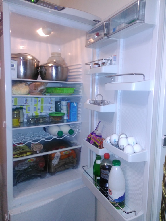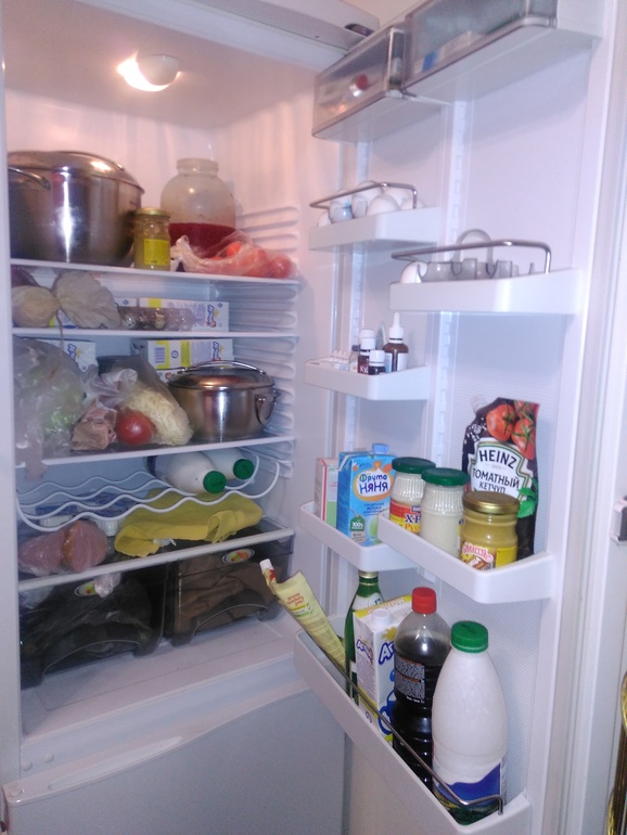 За 15 минут разобран холодильник. Недавно размораживали. Мало что на выброс. Покупаем по спискам. Кетчуп не едим. Гости забыли. Кексы убрала в контейнер. Удивила свечка. Молоко выпила) Протёрла и все аккуратно сложила. Глаза радуются.