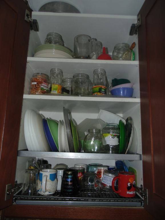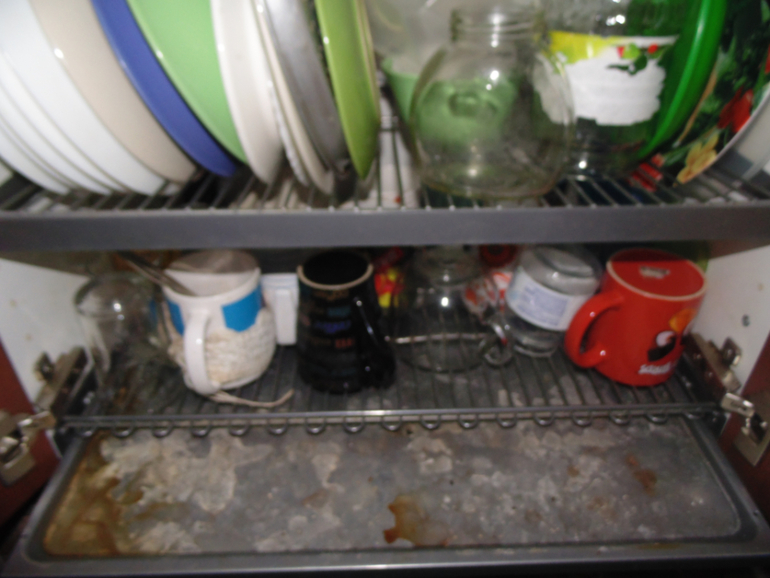 Под самым потолком у меня случилась нежданно-негаданная встреча. Чуть не упала в обморок, подняв подстилку для полки и увидев там усатого рыжего гостя. Фу, ужасные воспоминания из детства. Пришлось тщательно перемывать с порошком всё, что стояло в шкафу. Выбросила покоцанную плошку и пластиковую, которая меня раздражала, расставила банки. На удивление легко отмыла поддон.