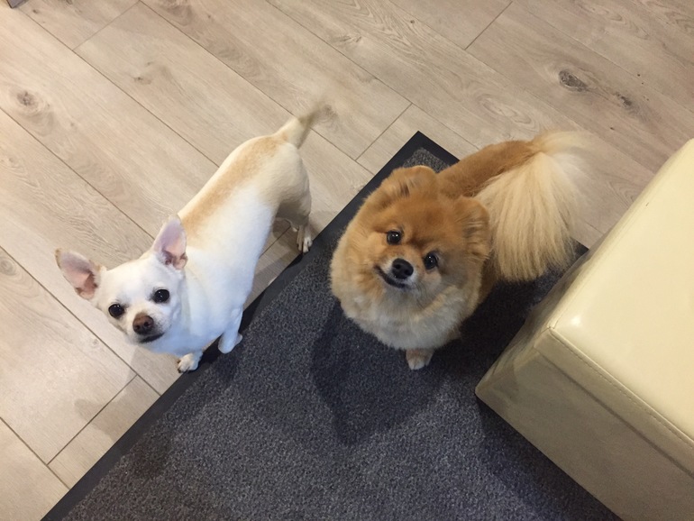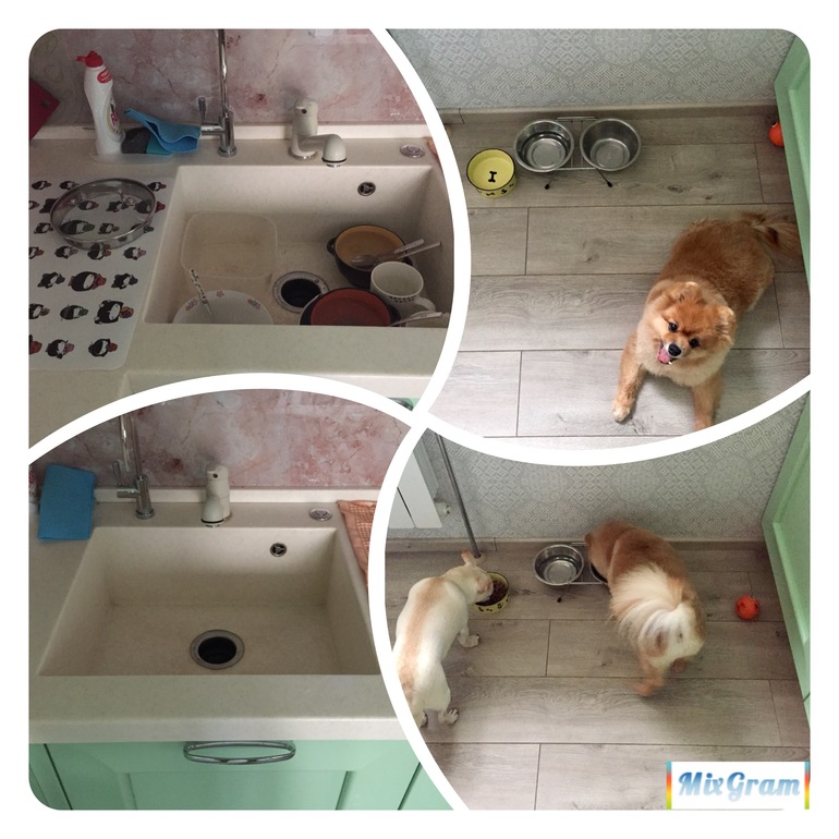По возвращению сразу приступаю к утренним рутинам ибо сегодня у старшей логопед и в 12.00 поеду за ней в сад. Сейчас время уже 9.00 и надо торопиться. Мою собакам лапы и иду на кухню, убирать после завтрака. Ставлю посуду в посудомойку, протираю стол и кормлю питомцев. Выглядит это примерно так))