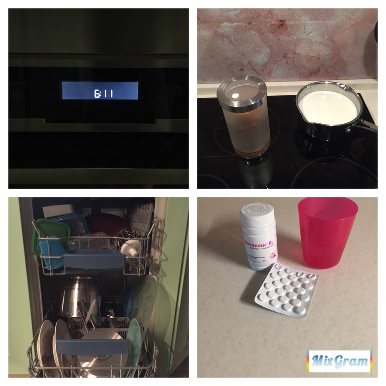 Мой день начинается раньше, чем у остальных домочадцев. Сегодня это 6.10, иду на кухню варить кашу. На тощак выпиваю стакан воды и свои витамины. Пока каша варится разгружаю посудомойку
