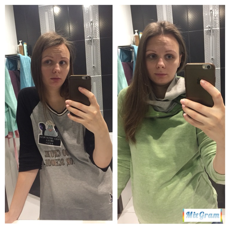 Кашу сварила, пошла умываться и приводить себя в порядок. Краситься особо я не люблю, поэтому только реснички подкрашиваю. Муж в это время просыпается и идёт в ванну, а я в комнату одеваться. На выходе буду выглядеть так))
