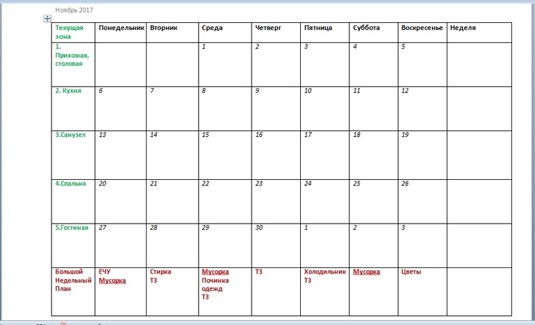 Нее) Большой недельный план, там дела, которые делаются всегда по определённым дням, независимо от текущей зоны-например, стирка раз в неделю по вторникам.
