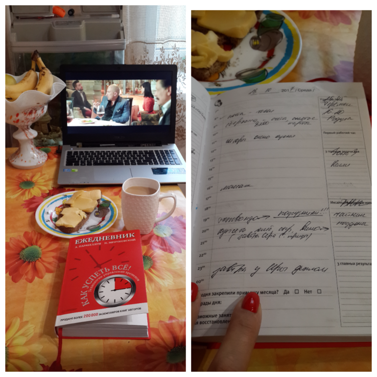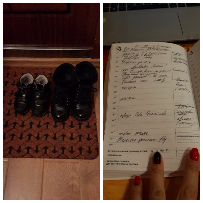 И тут можно...не отдыхать, конечно))) разбираем пакеты с Ашана, и вечерний каждодневчик - подготовить обувь на завтра. 20 минут отвожу, чтб поделать альбом Илюшке, наливаю на ночь ряженку и открываю свой Ежеднев...что сделала - что не успела, что на завтра - ооой - завтра сутра с обоими в поликлиннику - Илюшку прививку делать, Аришке - планово 3 месяца... значит иду за документами, чтоб не забыть с утра... в БНП на четверг внесланаконец то красоту)) - смотрю педикюр в номе - ногти - шиллак делаю в салоне, значит остается масочку на лицо...