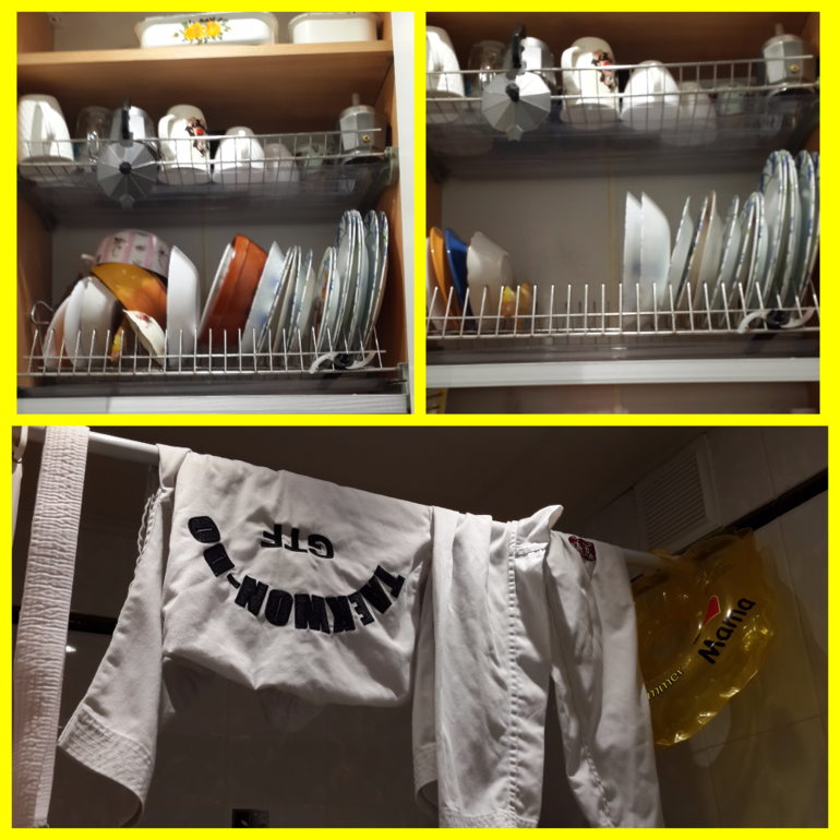 Дорога до сада и обратно занимает около получаса - за это время как раз варится каша, и придя домой, Ариша благополучно отправляется на балкон, а мама - хватает мусорку и бежит на улицу - благо баки как раз перед домом. Пока греется чайник, разгребаю еще один утренний каждодневчик - сушилку, и развешиваю форму Илюшки на вечер (закинула перед уходом).