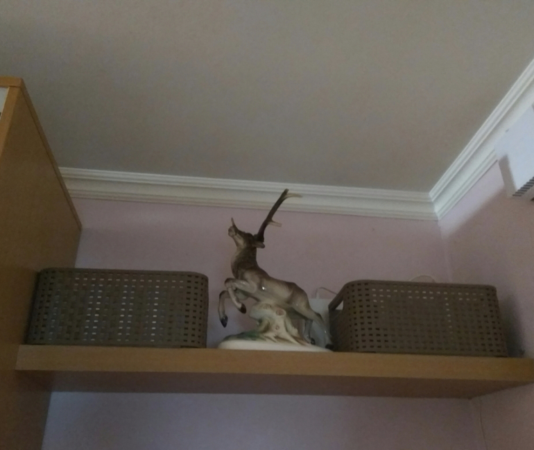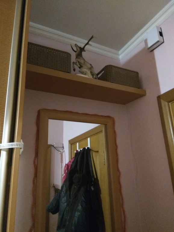 Я купила в Леруа полку в цвет шкафа и комода, корзинки там же плетеные и в результате теперь не видно эти провода и белую штуку, я получила место хранения запасов липких блоков из Икеа для чистки одежды и почётную миссию украшать коридор получил старинный олень, память от бабушки. Олень старше меня, он как память детства, очень дорог мне.