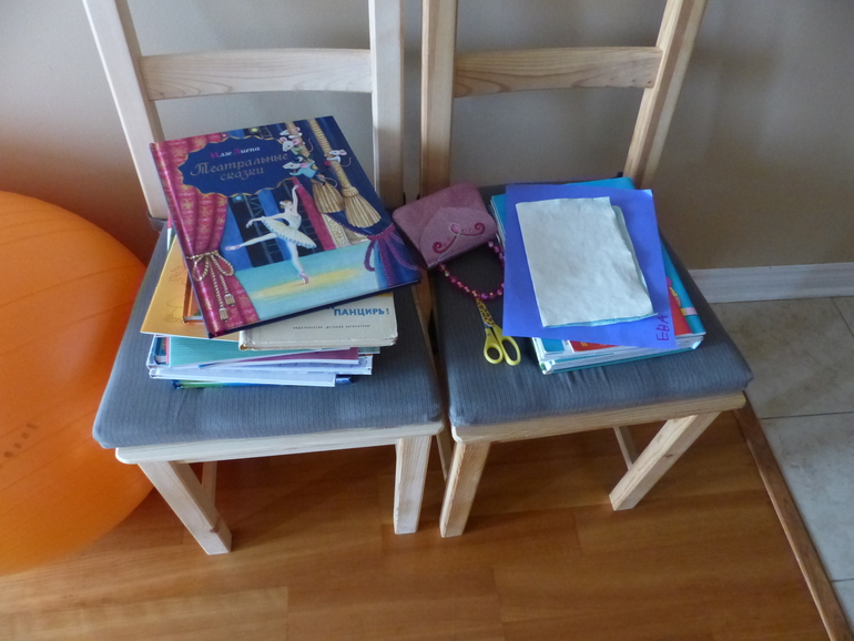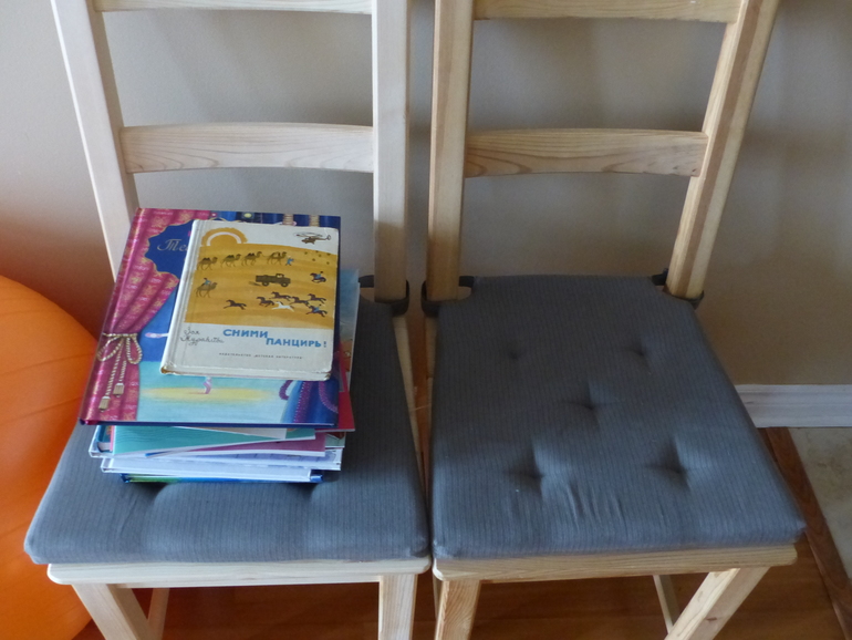 После уборки, книжки на стульях временно хранятся, пока я не придумаю куда их убрать, в книжный шкаф не лезут уже(( Хотим продать дочкин домик кукольный, все равно она в него не играет и туда еще докупить секцию к книжному шкафу, пока ставить не куда(