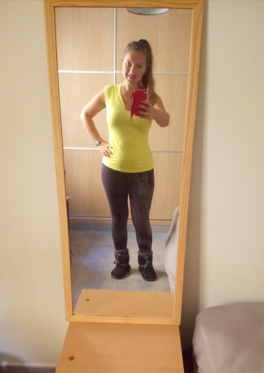 Хожу в принципе дома в том, в чем в фитнес-клуб ходила весной, в штанишках и футболках. Подумала, переодела майку: