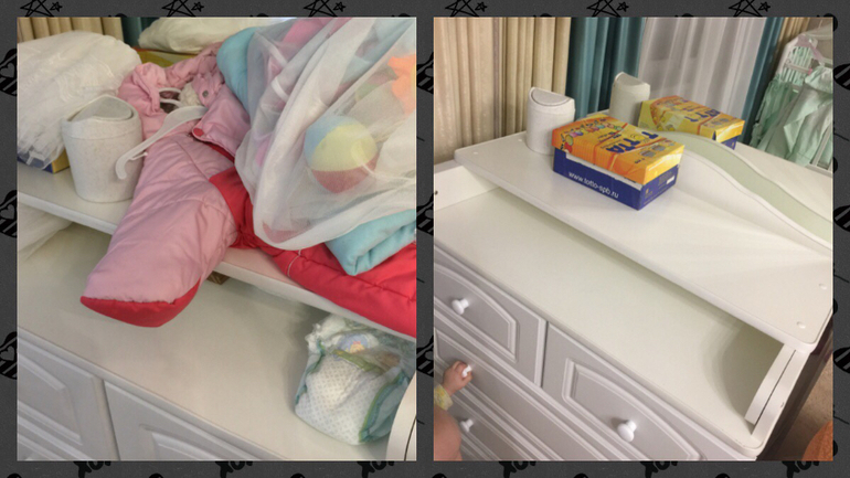 На стиралке, на старом столе, на икеевском столике, на комоде, полка в коридоре.
