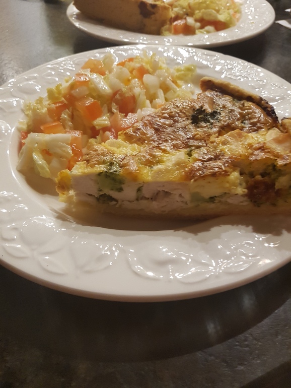 сегодня был киш с курицей и броколли, бульон с тортелини и салат из пекинки с помидорами