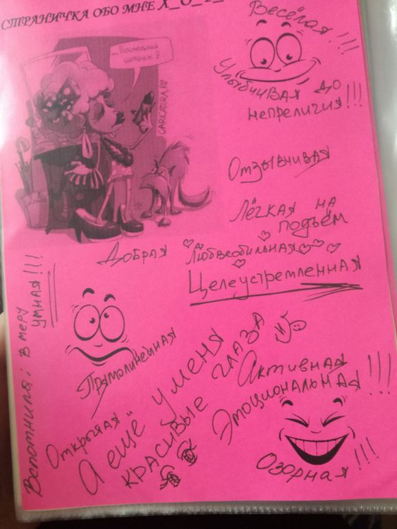 ХВалим себя!!! Я обязательно сделаю то что Таня написала про 25 положительных черт и 25 негативных и негативные переведу в положительные!!! Мне очень понравилось задание.... Но пока покажу страничку в своем КЖ по хвалению себя...честно она мне очень часто поднимает настроение!!!