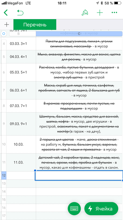 Табличку веду в телефоне, отмечаю зачеркиванием то, что выкидывается/отдаётся/пристраивается.