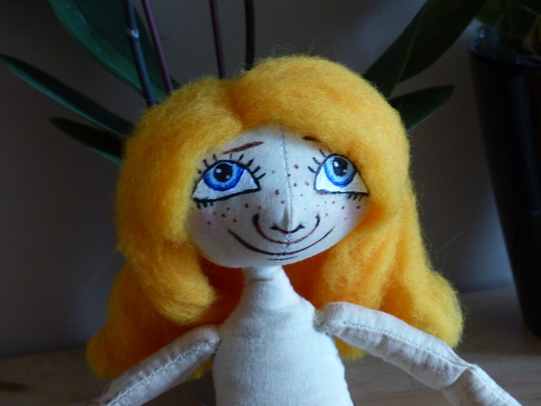 У меня дурдомная неделя вышла, сын явно против маминого творчества)) Спал днем два раза до 3 дня (в это время за дочкой в школу идем), думала вот один сон полностью уйдет под доделки, он стал спать второй сон позже на прогулке, ну думаю ладно буду в первый сон делать, фиг с ним с остальными делами, он стал спать по 30 минут, думаю хорошо, вечером спать уложу в 8-9 и сяду, он до 10.30 не спал....В итоге только в выходные смогла немного позаниматься тем чем хотела, так что в итоге только нарисовала лицо кукле и сделала волосы из шерсти для валяния. И то и другое делала первый раз в жизни, так что не судите строго. На этой неделе нужно одежку кукле сшить и пока дочка на каникулах, будем с ней поделки делать из наших запасов(много уже боюсь планировать).
