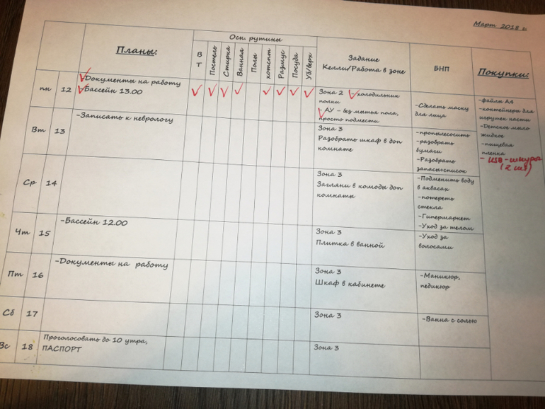 Семейный календарь мой выглядит вот так, на данный момент это самый удобный мой вариант!!! Работает это так: в вс вечером сажусь за комп и кж, сначала вписываю мероприятия семейные о которых я знаю, потом перераспределяю БНП, он иногда меняется в зависимости от моих планов...если день перегружен другими делами..ставлю работку попроще... После открываю план уборки по зонам и работу в зонах и выписываю распределяю по дням что надо бы сделать, дописываю список покупок того, что я уже знаю и все распечатываю и отправляю на холодильник!!!! Как результат муж видит, чем я занималась весь день и уже не злится, что он трудился а я отдыхала и чего-то там не сделала + сама вижу свои недоделки и обещаю взять себя в руки и продолжить летатеть:))))