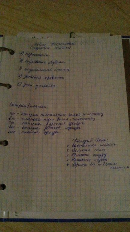 Таке есть разделы Я (план уходу за собой, список книг, список фильмов, график походов к врачу, мои исполняемые желания и др), ВНЕ ДОма (афиши мероприятий, места, которые хочу посетить, список вещей в дорогу и т.п.), Дети (здоровье, секции, инфрмация, план занятий, идеи для творчества), Важное (номера телефонов и др.), ПРОЕКТЫ (план рукоделия, бизнес-планы проектов, мои творческие идеи).