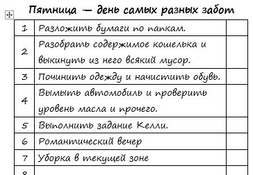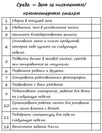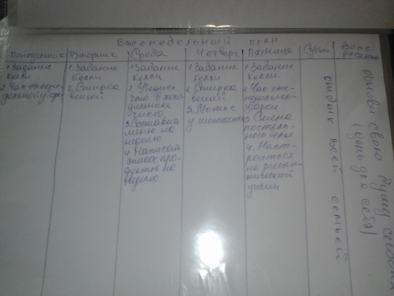 Мой БНП: Понедельник-навести порядок в шкафу в спальне и у детей Работа в зоне 15 мин Вторник-ЕЧУ Работа в зоне 15мин Среда-ЕЧУ Работа в зоне 15мин Четверг-Религиозные уроки Работа в зоне 15мин Пятница-Глажка Работа в зоне 15 минут Суббота-закупка продуктов и поход на базар Воскресенье-ВЫХОДНОЙ