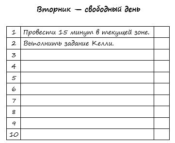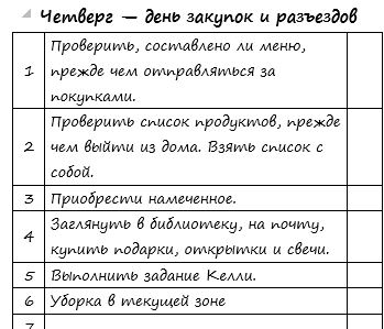 во-первых, выдохни. это систему нужно подстраивать под себя, а не наоборот. Зоны мы еще не проходили, скоро начнем. если что-то поменялось местами - не страшно. если ты болеешь, то либо проси помощи, либо не делай ничего. что касается таймера - его можно остановить или завести заново на ном моменте, когда что-то отвлекло. сумку и одежду готовить обязательно. всегда. даже проверить деньги для похода в магазин и выбросить чеки. Келли мы пока только читаем. Еще не делали. Свободные день тоже очень условная штука - смысл в том, чтобы было время на отдых и развлечения