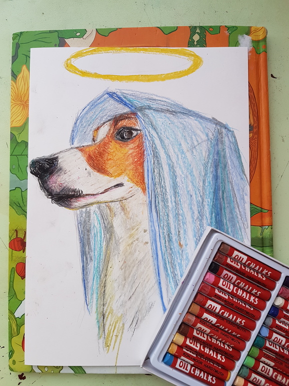 Творческое свидание. У меня год лежала запечатанная масляная пастель. Не знала, что с ней делать. Наконец собралась и попробовала. Результат мне не очень, рисовать ею не удобно, как детскими мелками. Нарисовала набросок с фото.