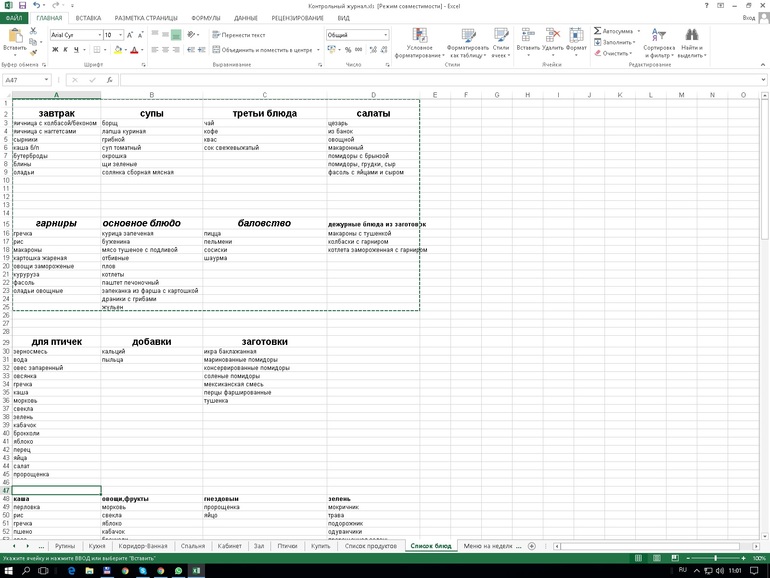 С планированием меню на неделю проблем нет, благодаря одному достаточно уже известному сайту. Сейчас готовлю простые блюда, где все можно сделать практически одной рукой. Максимально использую мультиварку и духовку. Есть глобальный список покупок в екселе, работаю с ним раз в месяц (перед зп). И есть список покупок на неделю, в КЖ. Всегда с ним сверяюсь, когда пишу список в магазин.