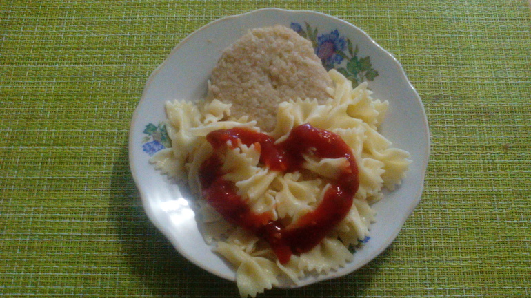 Ужин - рыбные котлеты на пару, макароны-бантики с кетчупом-лечо!