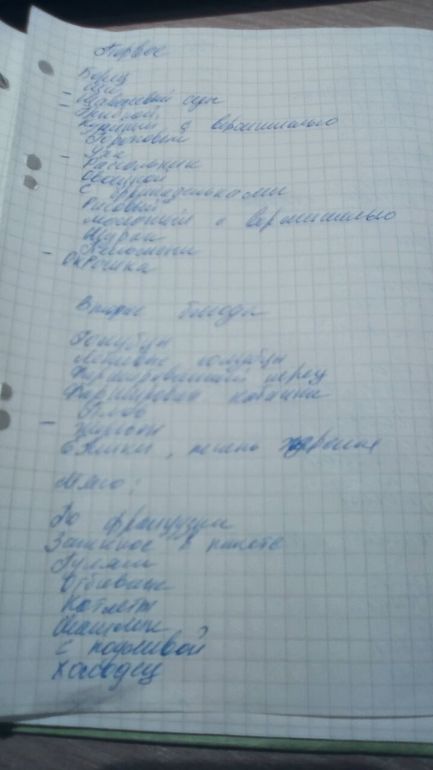 2. Пишем список блюд на обед, желательно разделить на категории, так же помечаем, для кого блюдо, быстрое или нет