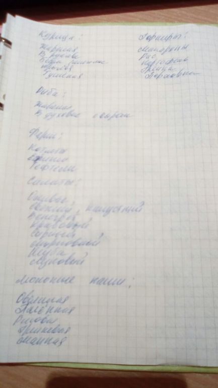1.основное блюдо, это рыбное или мясное (котлеты, тефтели, куриные ножки, суфле, и тд. Записываем с вариациями, тефтели с рисом, тефтели с гречкой, тефтели в томатном соусе, тефтели в сметанном соусе).