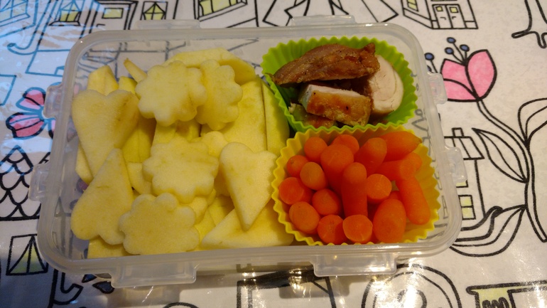 Суть перекусов с собой такая, что нужно делить порции "на один укус" - положил с рот и не вертишь в руках, других не волнуешь. Жуешь и жуешь. Хоть на перемене, хоть в транспорте (бывает и такое). Хорошо, когда несколько кусочков овощей собираются на шпажку, это удобно.