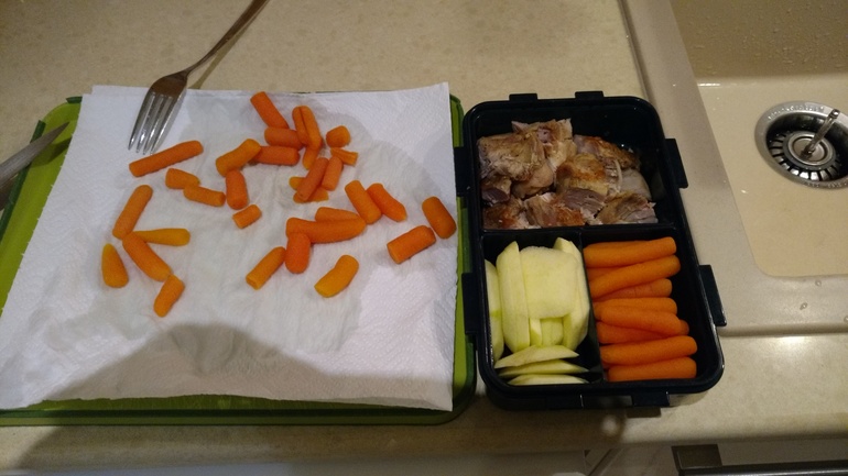 С картофелем меня выручает пакет для запекания в микроволновке за 4 минуты, купленный на али. Картофель получается не водянистый, как будто печеный, я его надрезаю, солю, сбрызгиваю маслом и укладываю в контейнер.