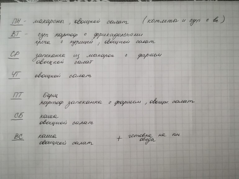 1. Распределение блюд по дням недели В ОБЩЕМ. То есть понедельник - готовим суп и второе, вторник - отдыхаем и тд. Этот список может нам оптимизировать наше время и поставить цели.