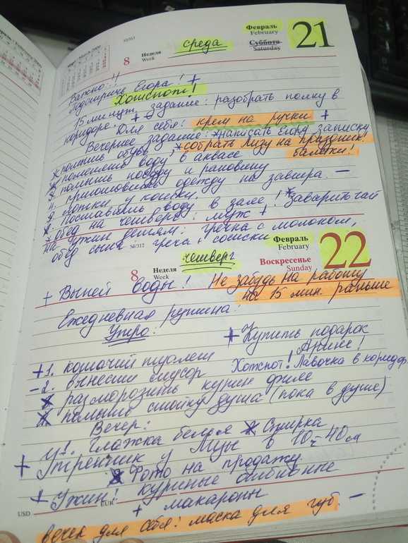 Прописано все досканально, что сделано стоит+, что не получилось -. Так удобно было редактировать свой день, вплоть до рутинок.