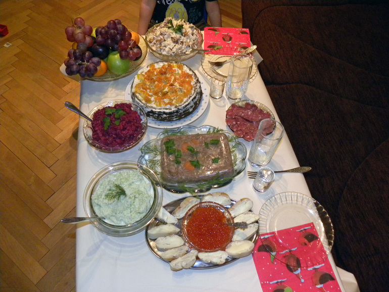 А с праздничными блюдами нет чего-то определённого. Раньше,как все-одивье,мимоза,крабовый. Сейчас какой-нибудь один из них делаю и то не всегда.Салаты теперь в основном овощные(рецепты частенько в интернете смотрю). Главное-мясо. Этим занимается всегда муж- или шашлыки,когда тепло;или в духовке что-то придумывает. Но-это он решает,когда в магазине мясо выбирает))
