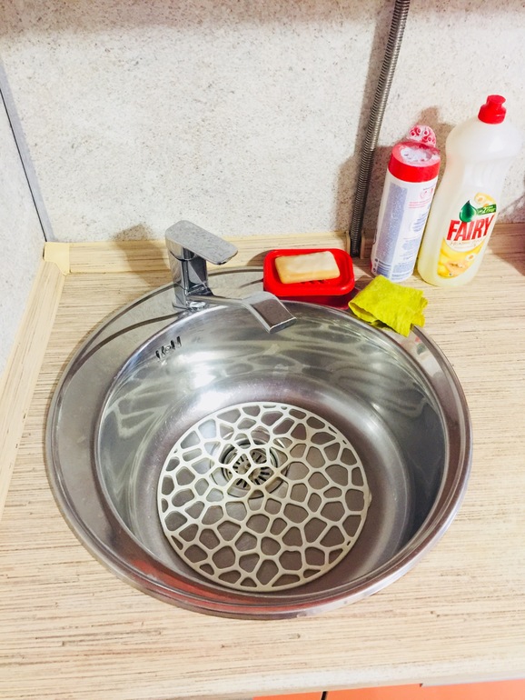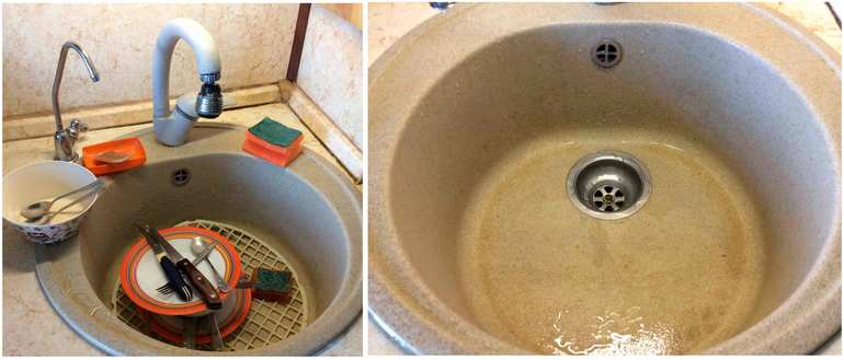 Итак, наши шаги: Обязательно как следует ополаскивайте раковину перед каждым шагом! При смешивании хлорсодержащих чистящих средств с бытовой химией на основе аммиака могут выделяться токсичные вещества! Чтобы избежать неприятных последствий я использую обычную соду или чистящие средства на растительной основе.