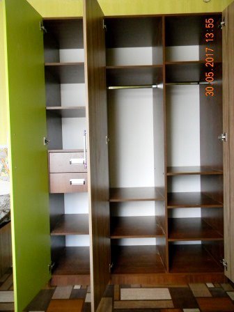 У нас один большой шкаф, в нем размещаю вещи двух детей, и немного своей.