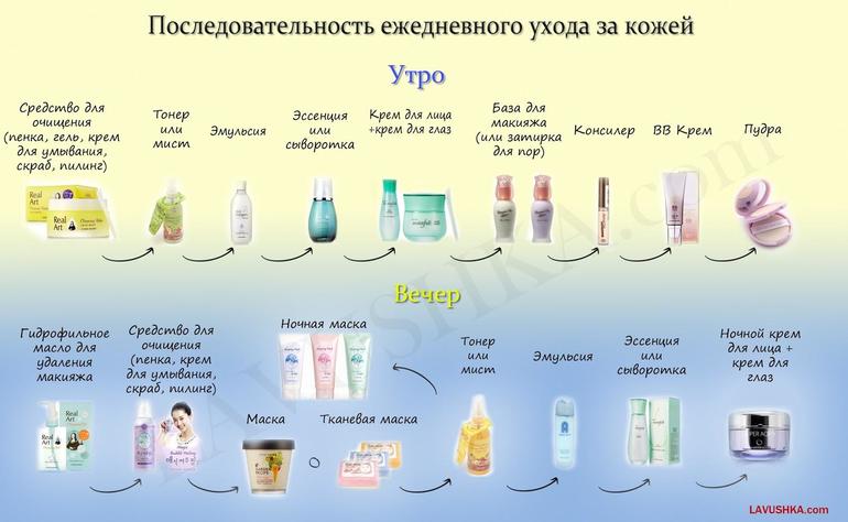 Не все шаги я использую лично для себя, например, утром у меня нет эссенции/сыворотки, базы под макияж, консилера и пудры - это только если на выход собираюсь; вечером я исключила - эмульсию, эссенцию/сыворотку. Но в целом уход выглядит именно так :)